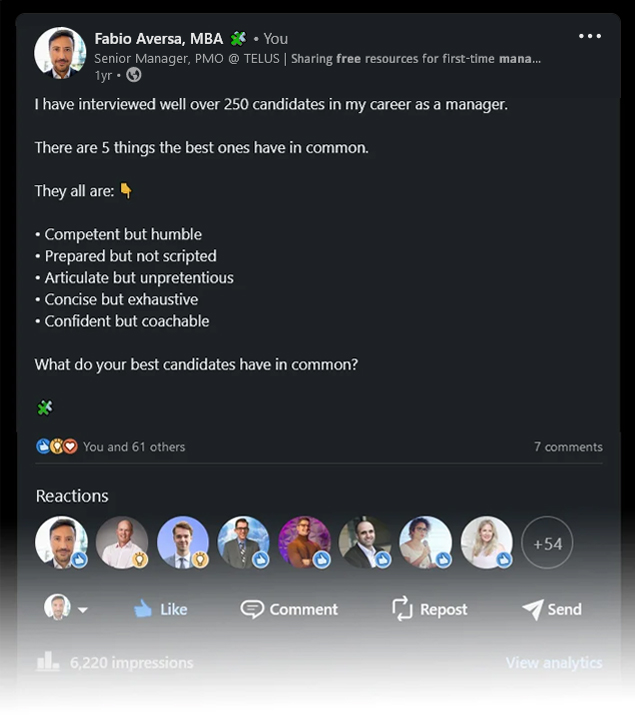 I'm Fabio Aversa, I've previously managed a large team of Business Analysts at TELUS, a major telecommunication company in Canada.
